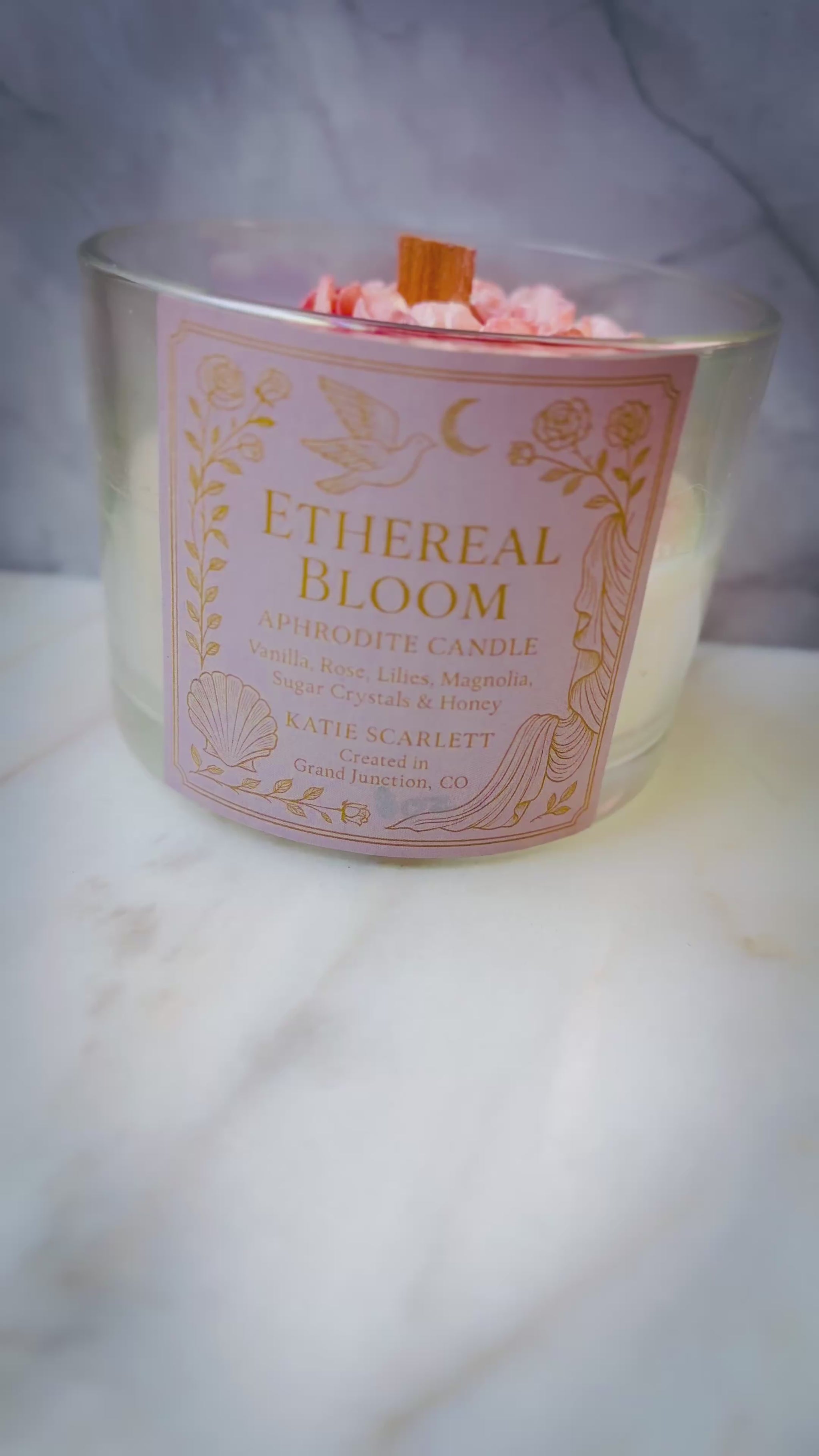 Indulge in the romance of the goddess of love with Aphrodite’s Ethereal Bloom, an 8 oz handcrafted luxury goddess candle made with a premium soy and coconut apricot wax blend. Adorned with a delicate hand dusted pink wax rose and shimmering oxidized gold foil (may appear green, this is normal and meant to oxidize and give the candle an aged aspect). This goddesscandle adds an enchanting fragrance of magnolia, Bohemian rose, pink sugar crystals, and warm ambered vanilla—layered with peony, primrose, honey, rose, and creamy cashmere. Perfect for goddess altars, self-care rituals, and romantic moments.