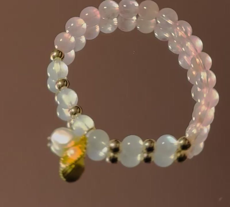 Aphrodite, the Greek goddess of love, beauty, and desire, is said to have been adorned with moonstone and rose quartz. These gemstones were believed to enhance her allure and attract love. The combination of these stones in this goddessbracelet is a tribute to the goddess and her powerful energy. The gold shell and pearls are a beautiful homage to Aphrodite’s symbolism.