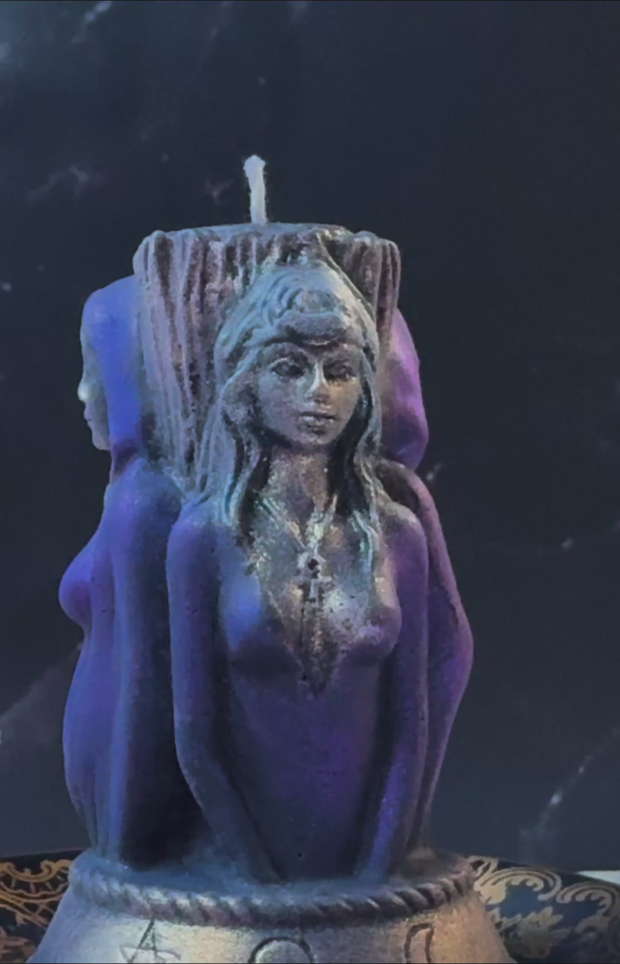 Design: Intricate three-sided pillar candle depicting the Maiden, Mother, and Crone. Dusted with mystical mica powder for a shimmer.